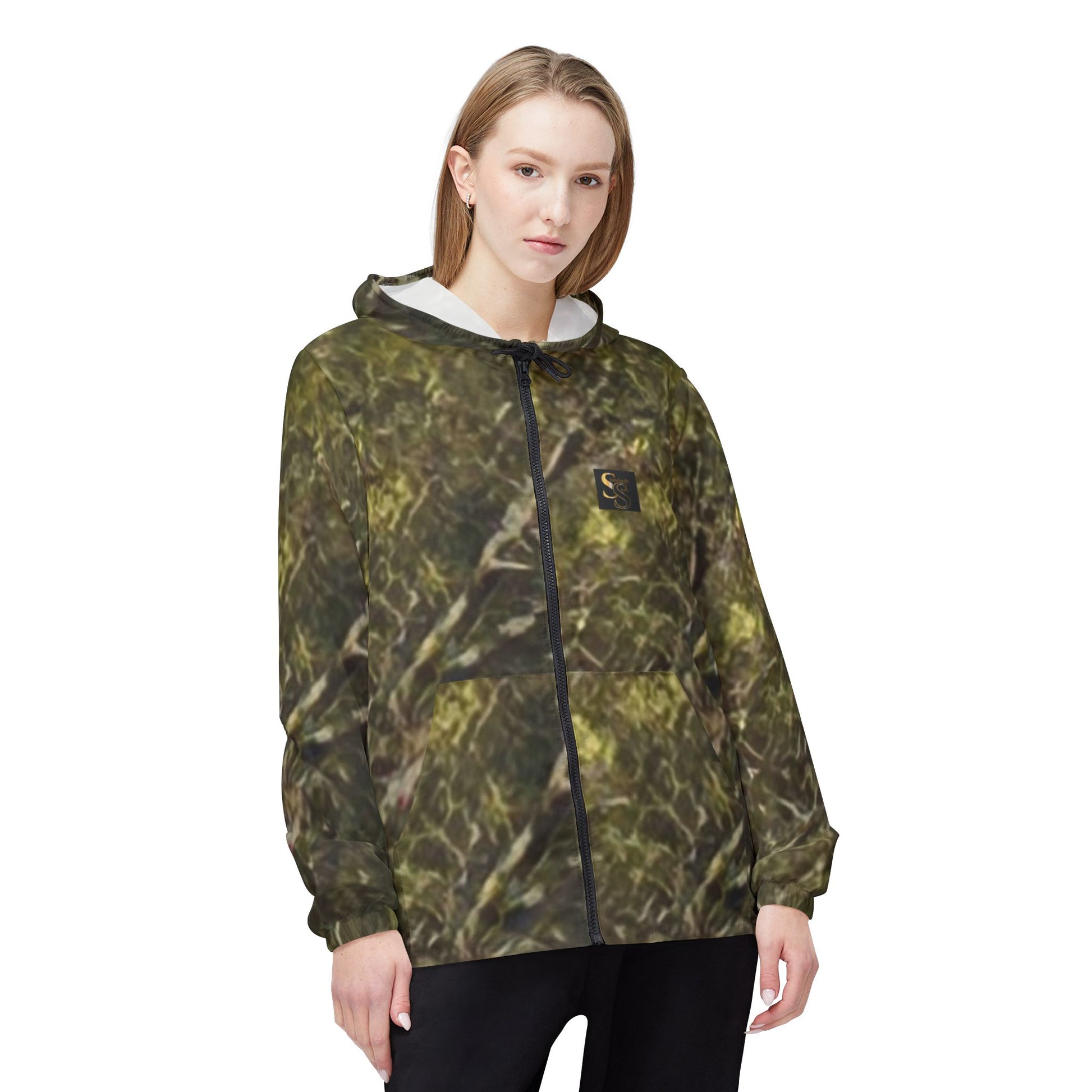 SS-Camo Print Windbreaker Jacket — Mossy Forest All-Over Zip Hooded Outerwear