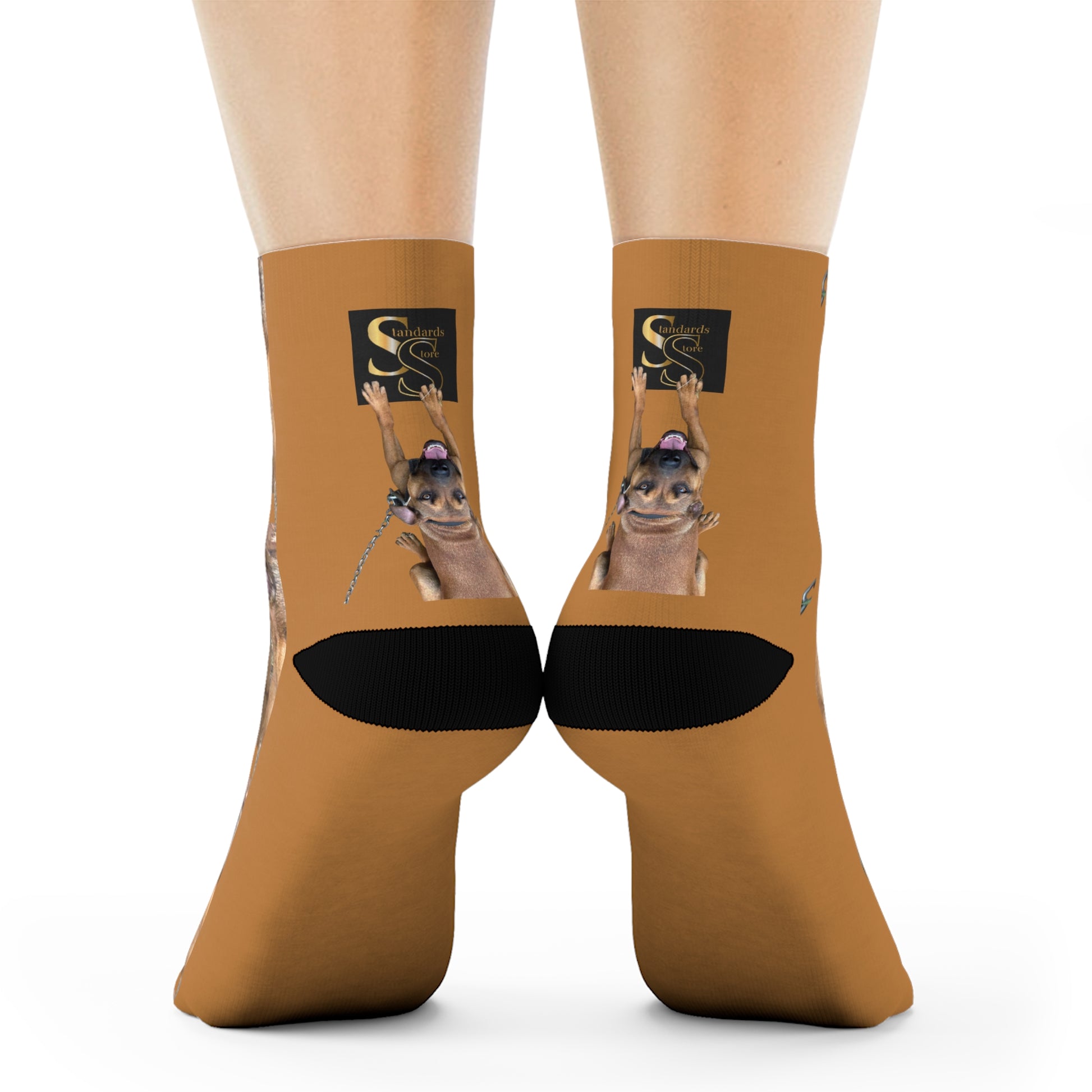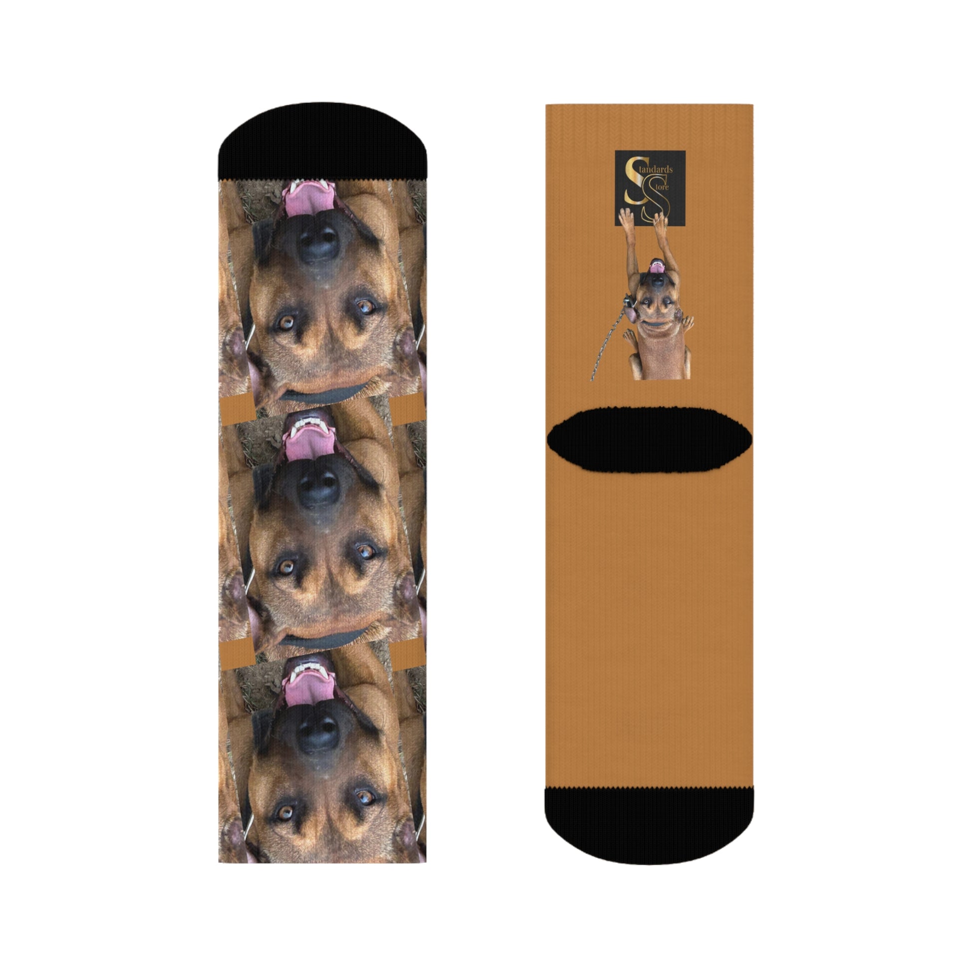 These crew socks carry a warm, familiar presence—your favorite dog’s grin repeated along a caramel backdrop with contrasting black heel and toe. The cushioned bottoms feel like a quiet, cozy step after a long walk; the seamless toe keeps irritation away during everyday wear. Lightweight polyester keeps the print crisp and the socks quick to dry, so those playful images stay bright through repeated wear. Slip them on for morning coffee runs, relaxed evenings at home, or when you want a small, joyful reminder of a loyal companion at your feet.